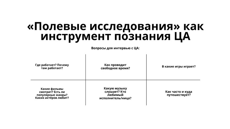 Для погружения в аудиторию мы провели полевые исследования. Я заимствовал технику из IT (CustDev Interview) и напрямую задавал аудитории вопросы. Это позволило составить портрет каждого сегмента: что они смотрят, слушают, как проходит их жизнь.