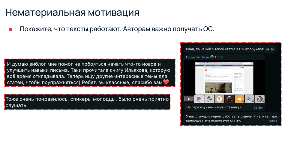 Также у нас есть свой чат, в котором ребята делятся различным фидбэком о подготовке статей с нашими редакторами и другими интересными моментами. Например, один из наших авторов поделился скриншотом, где показал, что в университете на вебинаре ведут лекцию и приводят в пример нашу статью с Хабра. Это круто, потому что мы видим, что это работает не только на бизнес, но и на образовательные цели. А это наш вклад в комьюнити, разработчиков, инфобезников и так далее.