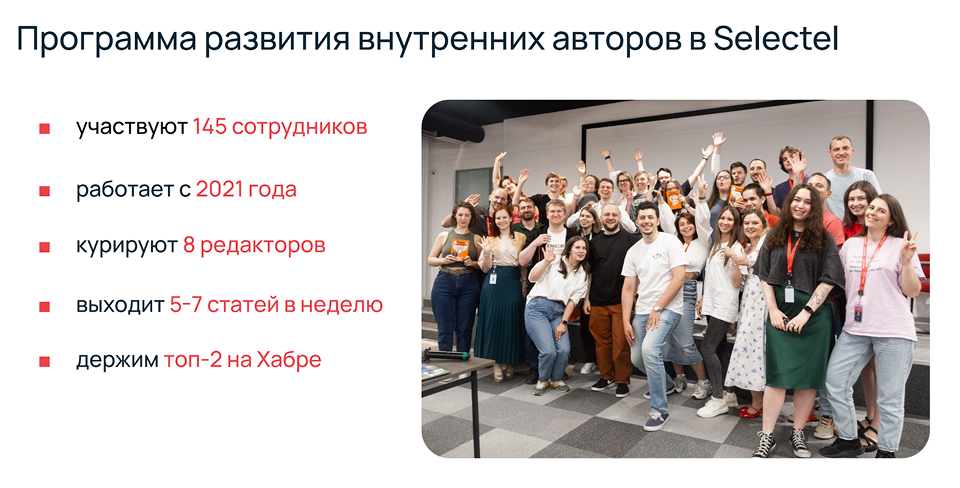 Получать поддержку от руководства. Например, в Selectel работа с контентом поддерживается всеми, от генерального директора до директора по маркетингу и директоров других департаментов. Потому что они знают, какой бизнес-эффект эта активность дает.