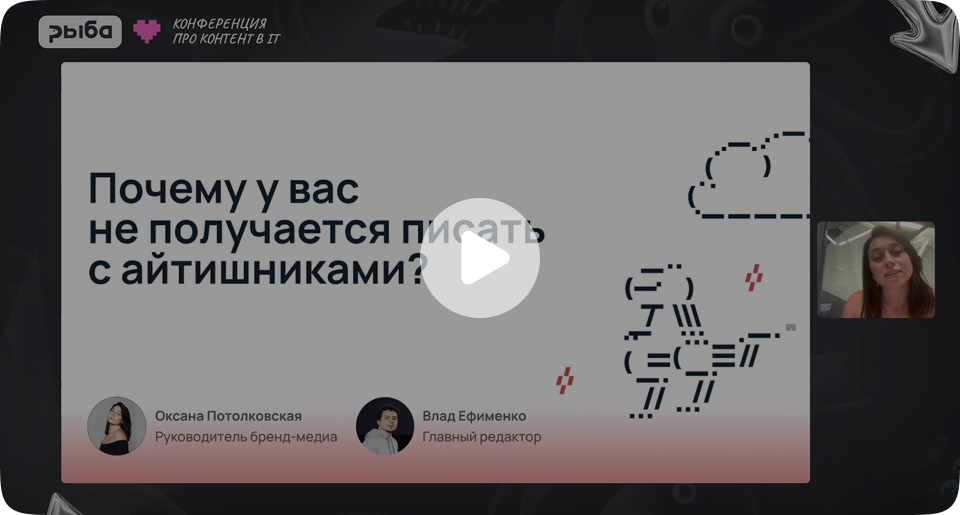 Я Оксана Потолковская, руковожу большим отделом бренд-медиа в Selectel. В нашем отделе много команд, и мы вместе занимаемся производством контента: ведем соцсети, с недавнего времени создаем видео, также работаем с блогерами, телеграм-каналами и, конечно же, ведем собственные блоги — Академию Selectel и блог на Хабрe. Одной из команд руководит Влад. Сегодня мы с ним расскажем о том, как сделать так, чтобы у вас продуктивно получалось писать тексты с айтишниками.