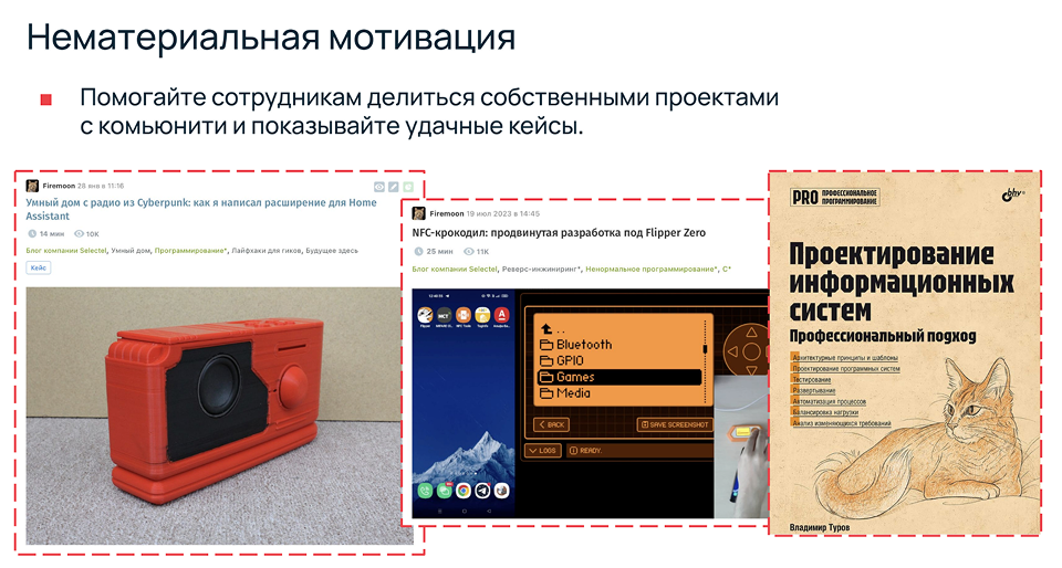 Без таких моментов у людей не будет интереса писать статьи. Например, у нас есть разработчик Вова. Он начинал с материалов о своих pet-проектах. В одной статье Вова рассказал, как сделал радио из Cyberpunk с помощью 3D-принтера и запрограммировал его. Получилось круто: просмотры были, лайки тоже — и он решил писать дальше. В итоге Вова дошел до того, что недавно выпустил собственную книгу. Мы гордимся этим кейсом, рассказываем его авторам, чтобы их мотивировать.