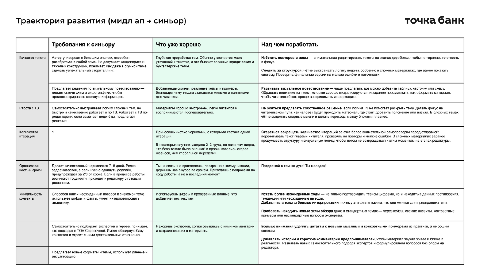 Траектория развития. Если автор хочет расти быстрее, он может запросить полноценную траекторию развития. Мы вместе смотрим тексты, обсуждаем динамику, отмечаем, что получилось хорошо, и собираем небольшой план: какие навыки прокачать, чтобы перейти на следующий грейд.