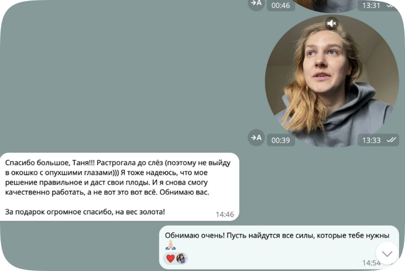 Например, одна авторка поделилась со мной, что переживает развод. Я тоже человек, который это проходил. Записала ей пару видеосообщений в Телеграме и отправила небольшой подарок, чтобы поддержать.