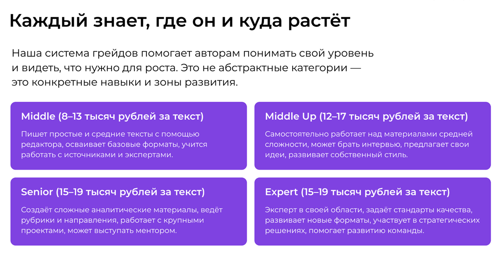 Это снижает тревогу, убирает догадки и делает переходы по грейдам спокойными и прозрачными — как для автора, так и для редакторов.