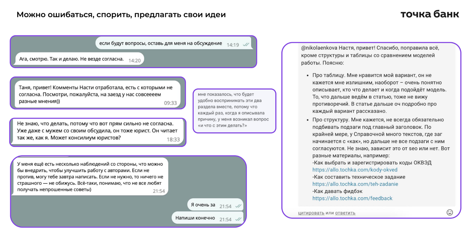 Фидбэк в такой атмосфере воспринимается не как критика, а как помощь. Это возможно, только если между редактором и автором есть доверие: когда люди понимают, что цель у всех одна — сделать текст лучше.