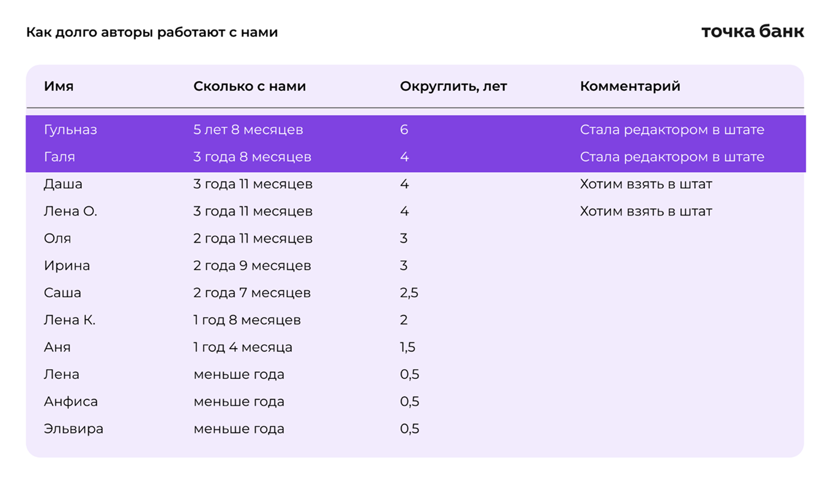 Авторы остаются с нами годами. Сейчас в команде 12 человек, и, если посмотреть, когда каждый пришел, видно: семеро работают больше двух с половиной лет, четверо — больше четырех. Двое за это время перешли к нам в штат. Еще двое недавно написали, что хотели бы перейти в штат, когда появятся свободные ставки, — для меня это знак того, что людям у нас комфортно.