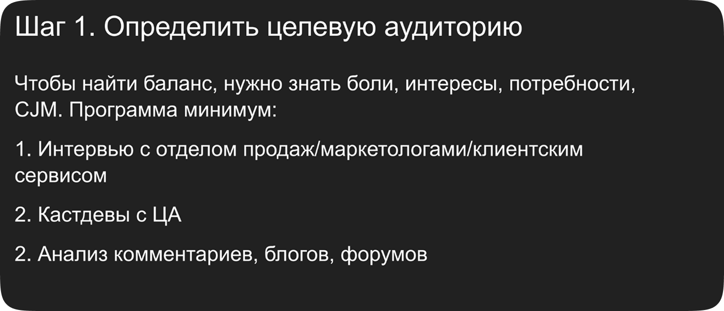 Чтобы найти баланс, нужно изучать аудиторию, понимать ее боли, интересы, потребности, знать путь пользователя. Это всё можно сделать с помощью кастдевов, анализов комментариев, общения с отделом продаж и клиентским сервисом. Причем довольно быстро, эффективно и не супердорого.