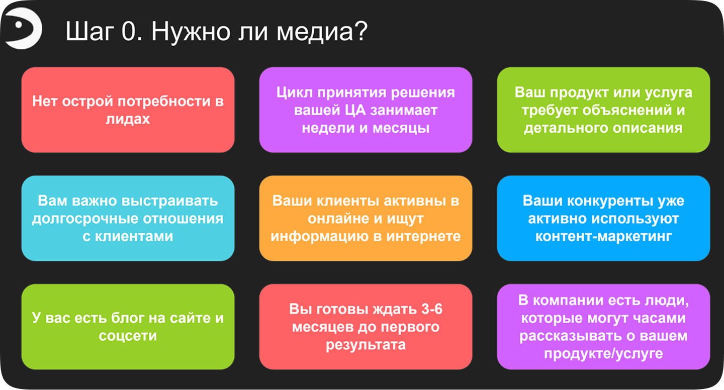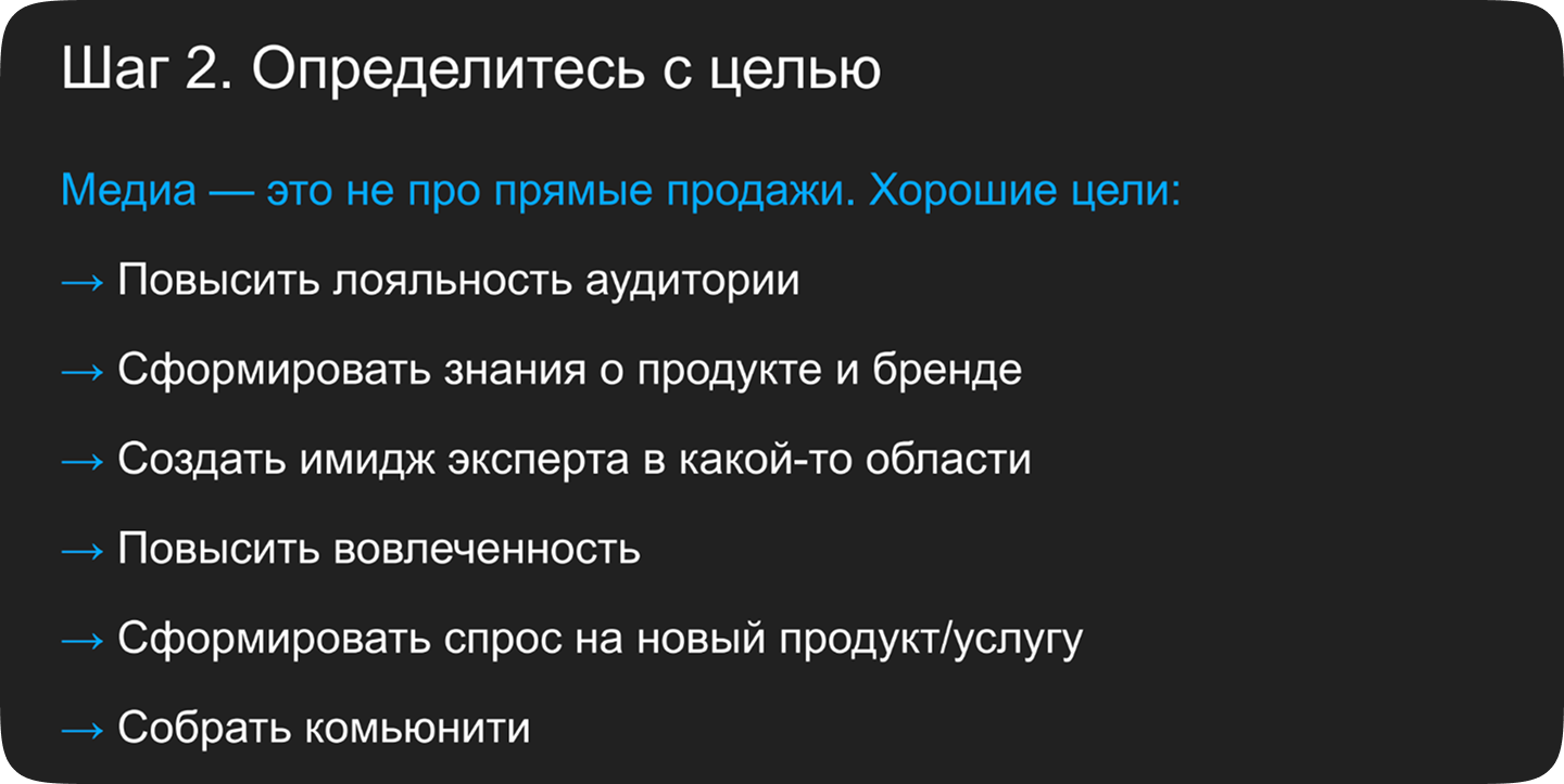 Если мы делаем медиа для всех, то значит, мы делаем медиа ни для кого. Важно помнить о целевой аудитории и подбирать контент под нее, а не под продукты компании. Так, в медиа для опытных предпринимателей появляется статья на тему «Как оформить самозанятость». Хотя люди, которые будут целевой аудиторией журнала, уже давно оформили ИП.