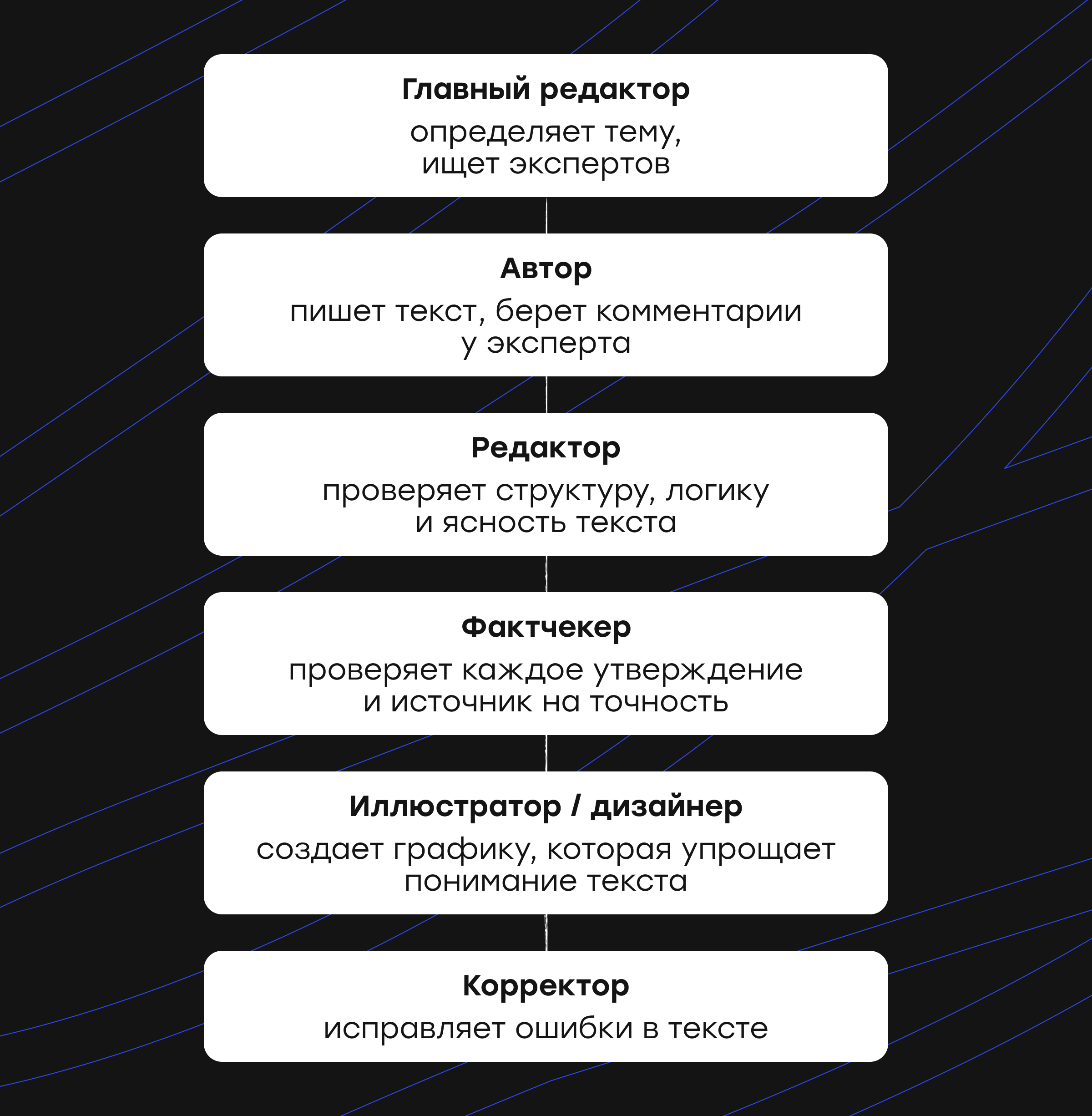 Фактчекер. Единственный специалист, которого нет в обычной редакции. Он проверяет каждое утверждение в статье на достоверность.