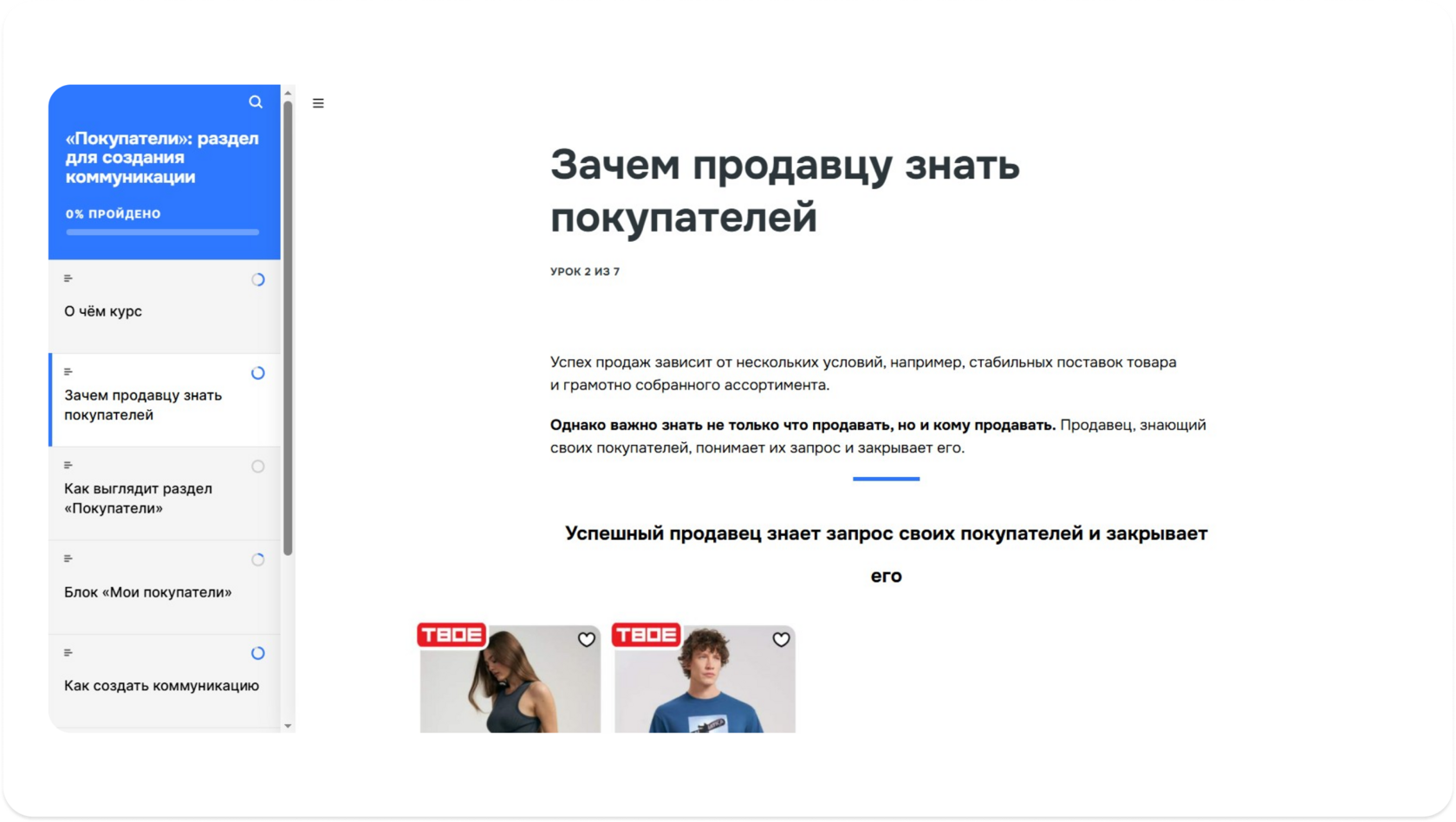 Например, в курсе «„Покупатели“: раздел для создания коммуникации» шесть уроков. Продавец может кликнуть на любой из них в содержании и сразу открыть нужную тему
