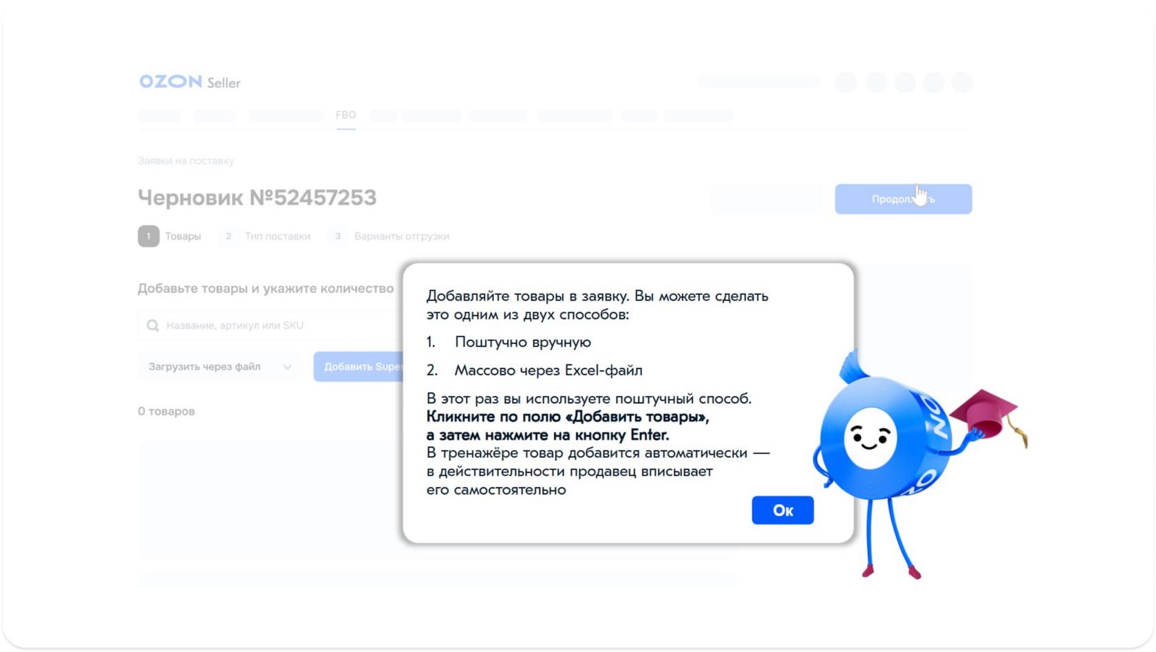 В тренажере можно отрабатывать разные процессы. Например, на скрине продавец учится создавать заявку на поставку товаров