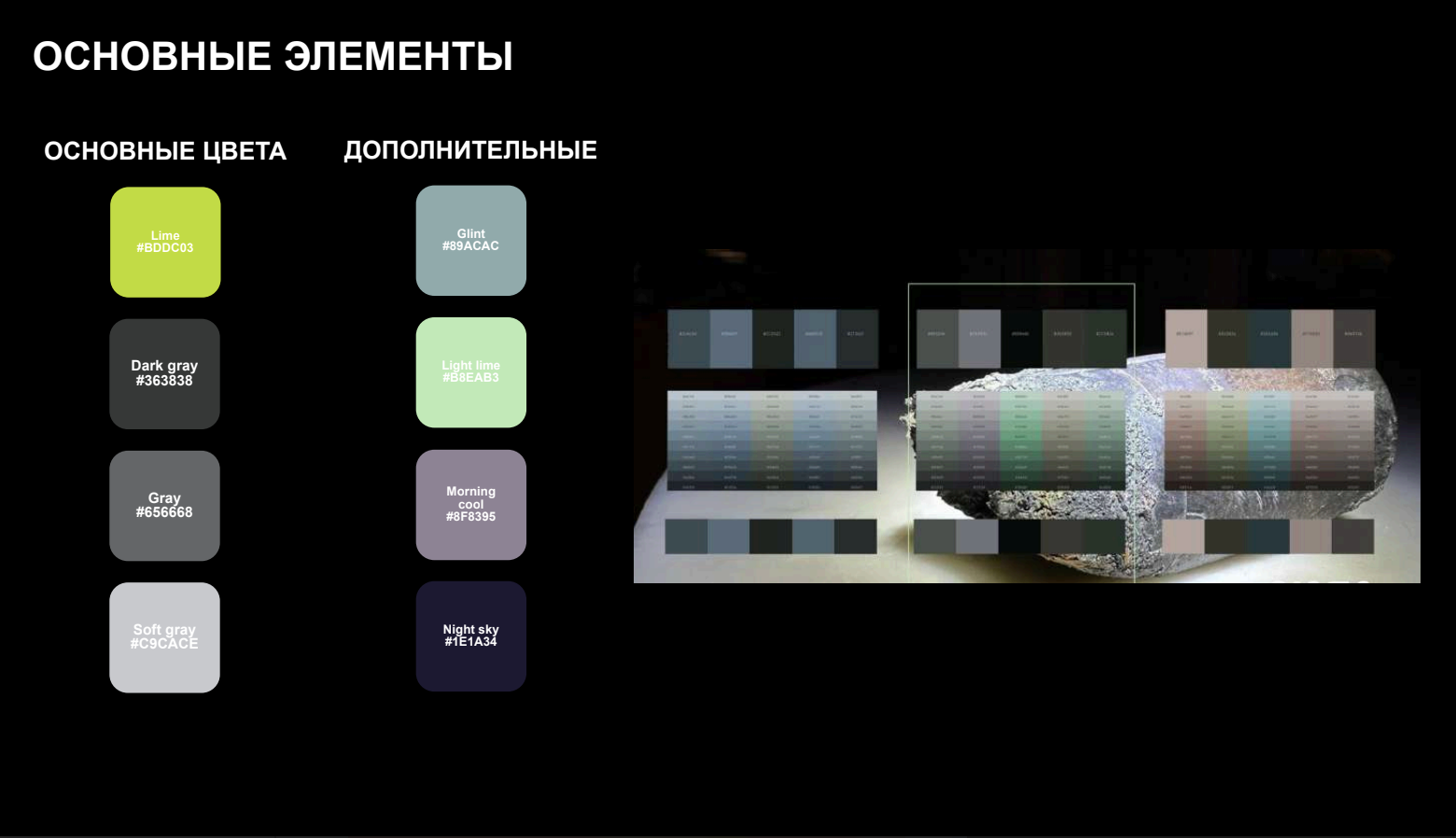 Наша команда связалась с учеными, которые изучали упавший осколок, попросили отправить нам фотографии объекта. Так, мы получили 8 основных цветов нового брендбука компании